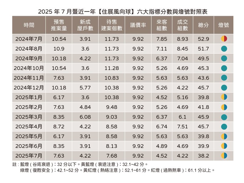 代表北台灣新建案市場概況的「住展風向球」,7月燈號持續衰退的黃藍燈,分數是38.2分,為今年的第5顆黃藍燈,乃新冠疫情後的最窘狀態,六大構成項目呈現「一升、一平、四降」,新成屋戶數上升,預售屋推案量、成交組數、來客組數、待售建案數分數下滑,議價率持平。