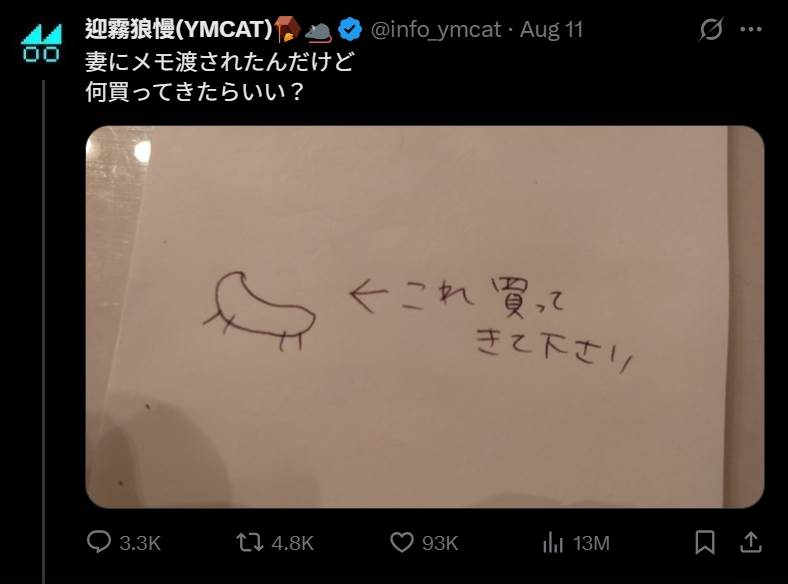 「迎霧狼慢」在盂蘭盆節前夕於X發文表示:「老婆給我留了張便條,我該買什麼回來好呢?」並曬出手繪的代購清單,只見紙條上畫著一個條狀物,底下插著四條「腿」,圖樣相當奇特。