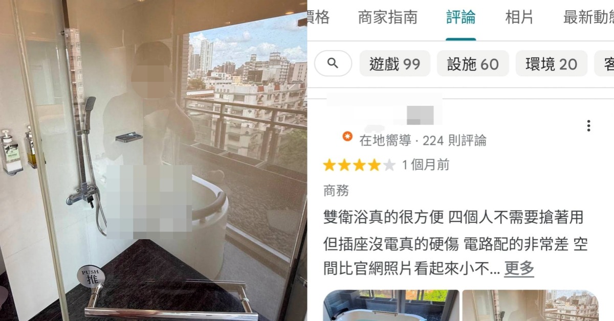 有男子入住台中某5星級飯店後,在Google留下4星評論,寫下「雙衛浴真的很方便,4個人不需要搶著用」等心得,並附上6張房間內部照片,不過仔細一看,該名男子在拍攝淋浴空間時,整個人的倒影全顯現在浴室玻璃門上,更離譜的是,他是處於「全裸備戰狀態」。