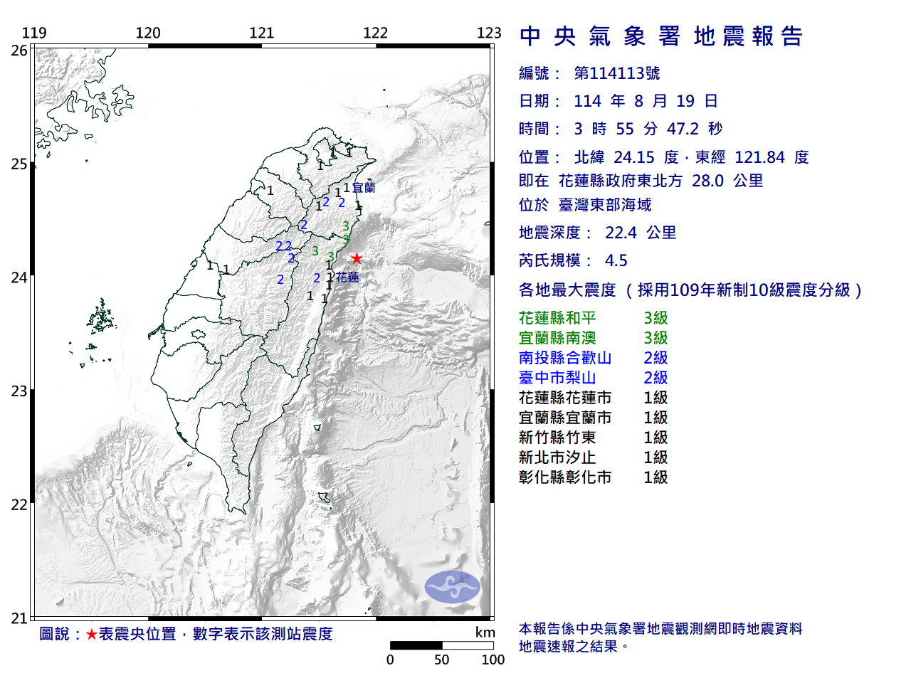 中央氣象署發布顯著有感地震最新消息,今(19)日3時55分,發生芮氏規模4.5有感地震,震央位置在花蓮縣政府東北方 28.0 公里 (位於臺灣東部海域),震源深度22.4公里。