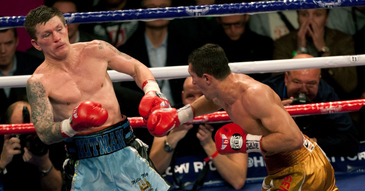 2012年11月24日,英國選手里奇·哈頓(左)在英國曼徹斯特的曼徹斯特晚間新聞體育館對陣烏克蘭選手維亞切斯拉夫·森琴科。(圖/美聯社)