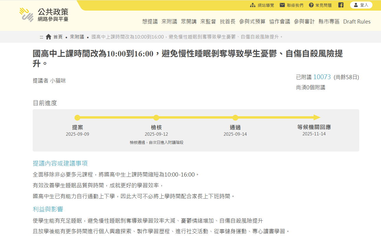 教育改革一直是我國炙手可熱的話題之一。有民眾在9日於「公共政策網路參與平台」提案,主張將國高中學生的上課時間延後至早上10點,並在下午4點下課,以改善學生睡眠品質不均與時間不足的問題,成就更好的學習效率。截至今(15)日上午8時止,最新附議人數已高達10,073人,根據《公共政策網路參與實施要點》,教育部也必須在這天前做出正式回應。