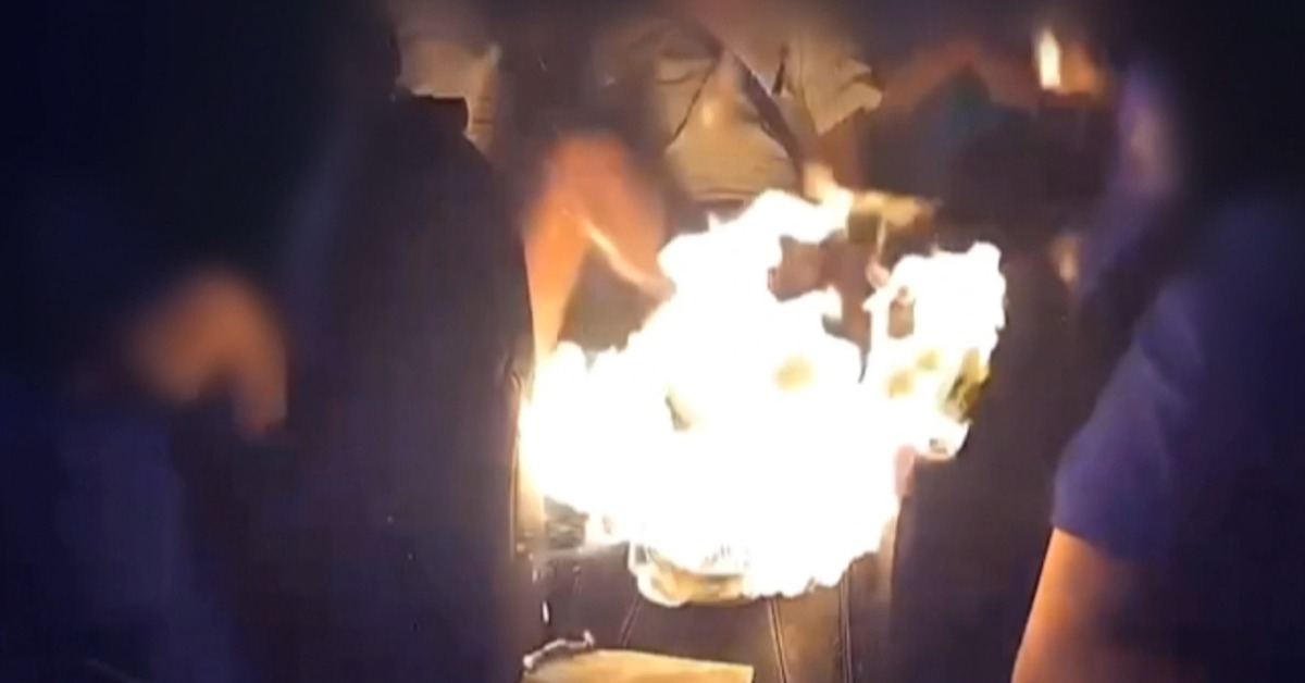 蹦一聲巨大聲響,扶手中央的小型電扇突然爆炸,車內一瞬間竄出火光。媽媽趕緊把包包覆在起火點上,試圖撲滅火勢,但火焰仍持續燃燒,絲毫沒有減弱的跡象。當事家人:「水壺水壺。」